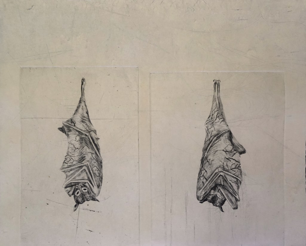 1-Pipistrelli Dry point and soft ground on Kitakata paper. 43×52 cm Year 2023. Available through the artist